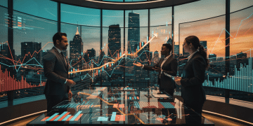Futuristic digital cityscape showcasing interconnected financial networks and digital currency symbols.